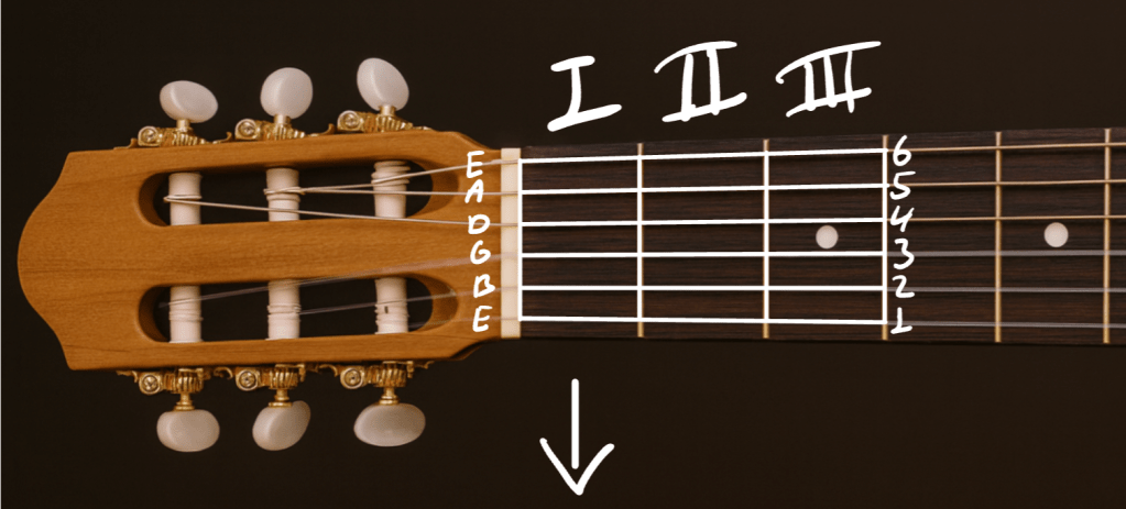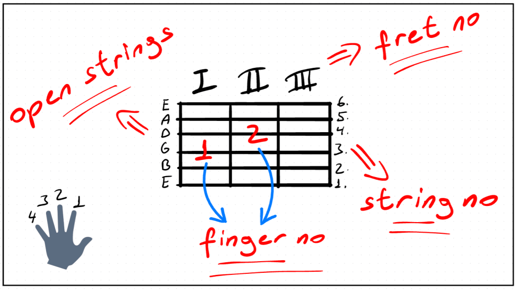 To be able to play chords on the guitar, we need a system that shows specific finger positions for the left hand. This system is very similar to tablature. In the tablature system, the sixth string is shown on the lowest line, while in the chord tablature system, the sixth string is shown on the top line. Simply put, in the chord tablature system we imagine looking at the guitar fretboard as if we were seeing it in a mirror: