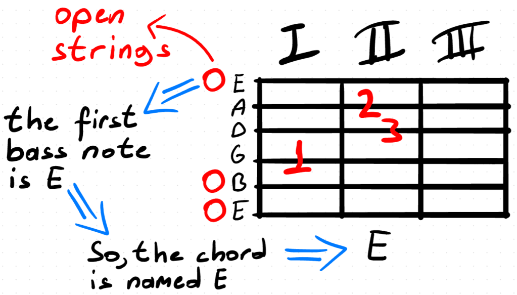 We said that the bass note is the first note where the chord begins. In the example above, we started the E chord on the sixth string because the first bass note on that string is E.