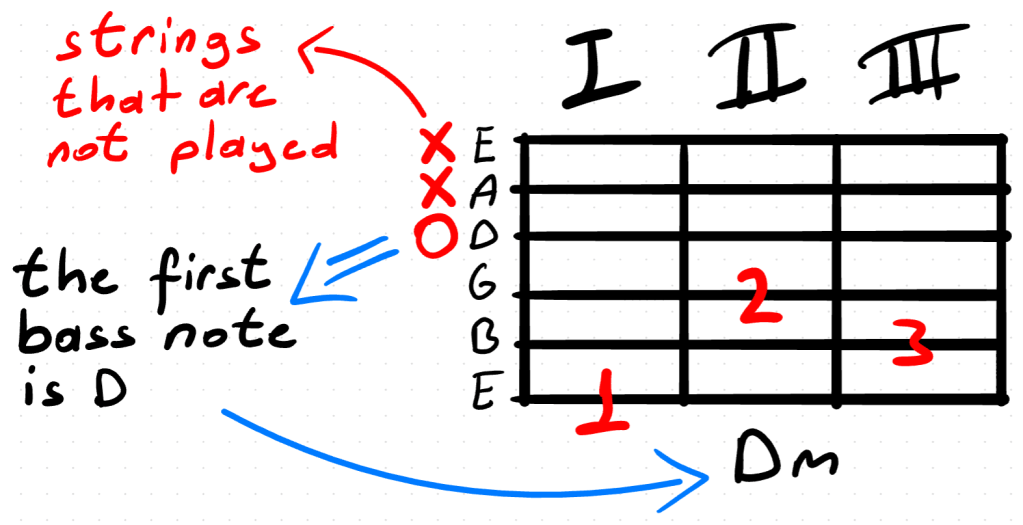 However, in some chords we do not play certain bass strings. The reason is that the open strings may contain notes that are not part of the chord, or even if they are, they may make the chord sound too crowded. We will cover this in detail in the theory section.