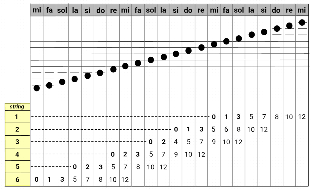 Let’s learn the locations and names of the notes on the first three frets of the six strings shown in bold. While practicing, saying the name of each note out loud as you play it will speed up your learning process.