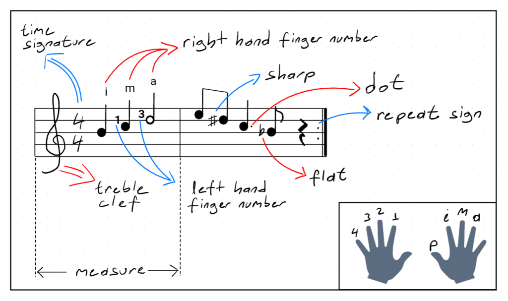 Time Signature: Shows how many beats are in each measure and which note value gets one beat.