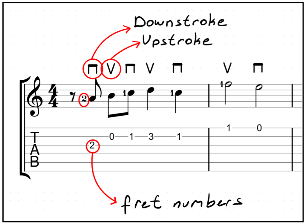 Because note durations cannot always be clearly seen in tablature, we display standard notation and tablature together. The numbers on the tablature indicate the guitar frets, while the symbols on the tablature show downstrokes and upstrokes.